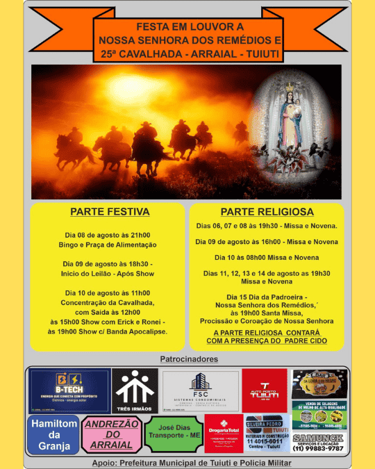 Agenda e Eventos Festa em Louvor a Nossa Senhora dos Remédios e 25ª Cavalhada Bairro do Arraial em Tuiuti Veja Mais »